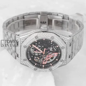 Full Stone Silver Black Skeleton Dial Automatic Watch