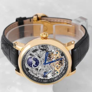 Tourbillon Moon Phase Yellow Gold Watch with Black Skeleton Dial and Leather Strap