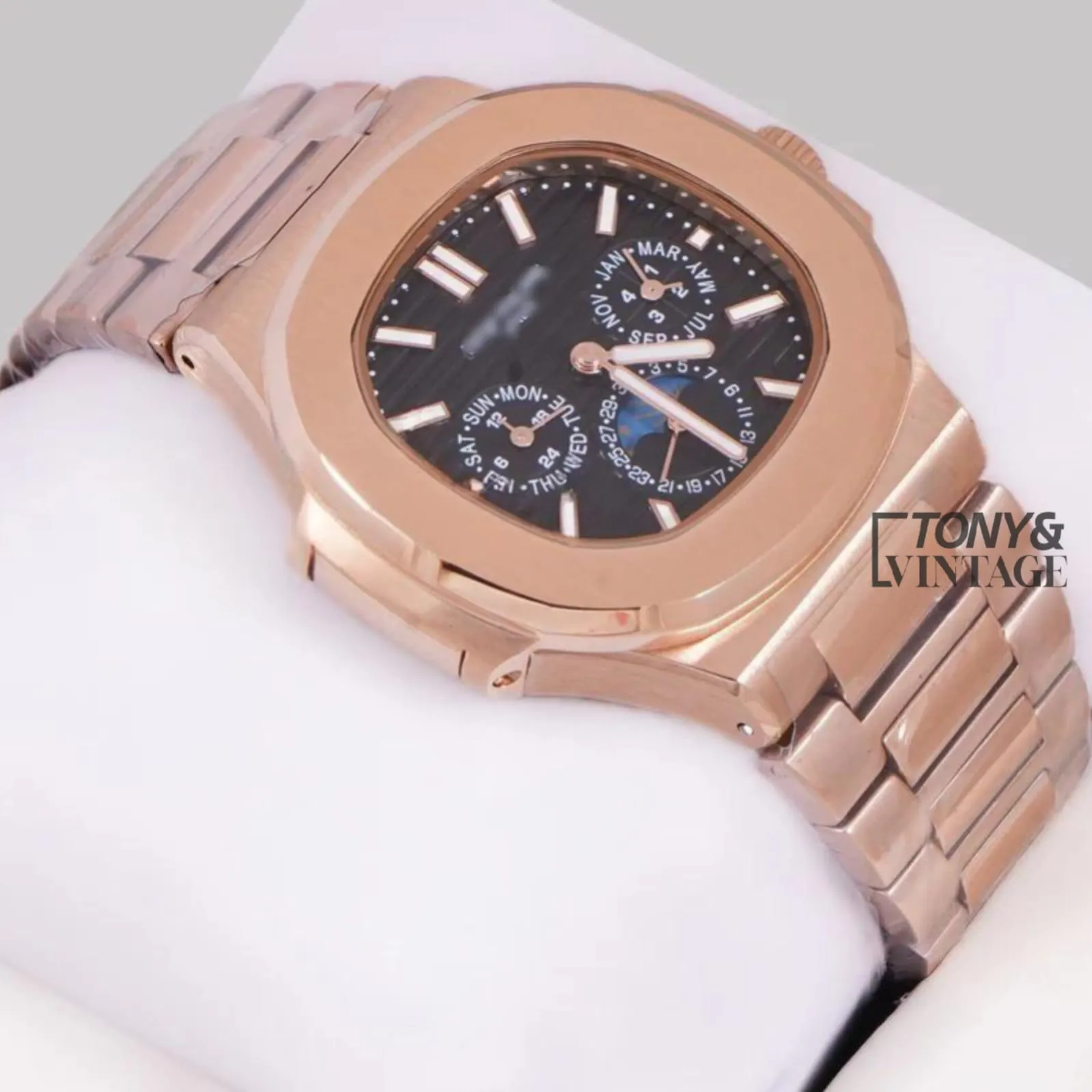 Be the first to review “Moon Phase Chronograph Rose Gold Automatic Watch with Black Dial”