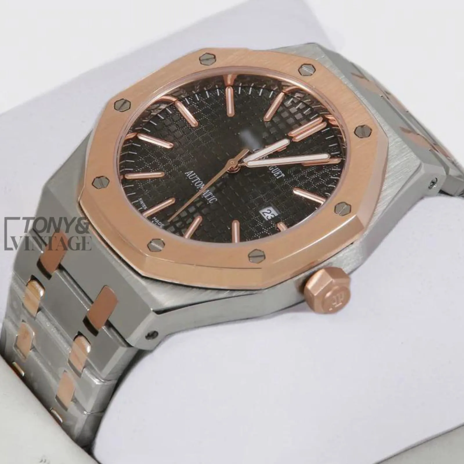 Be the first to review “Oak Two Tone Rose Gold Silver Chain Black Dial”