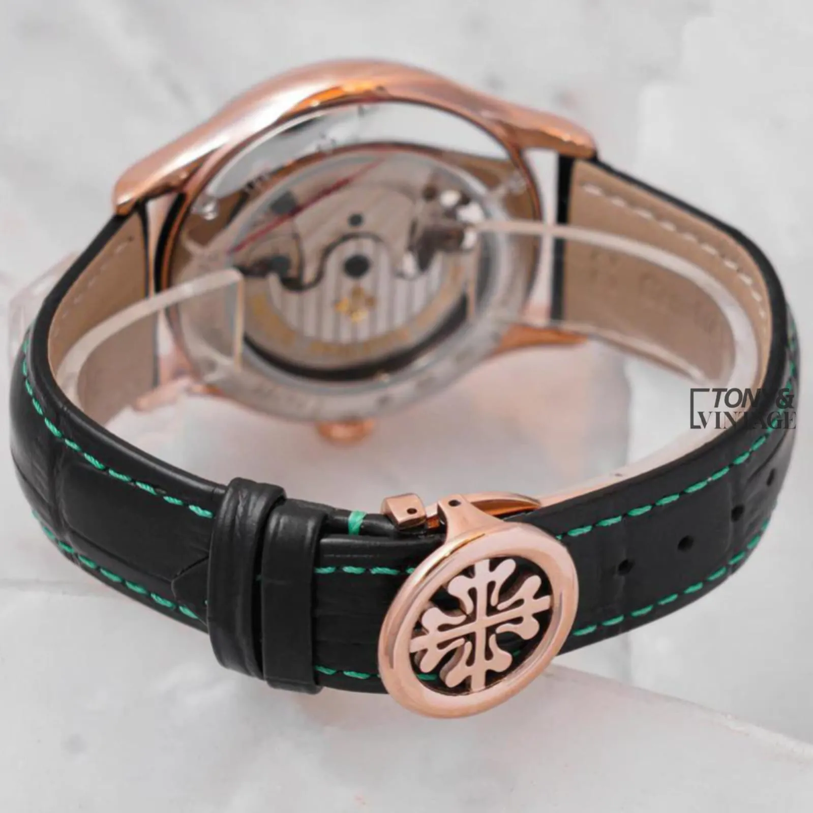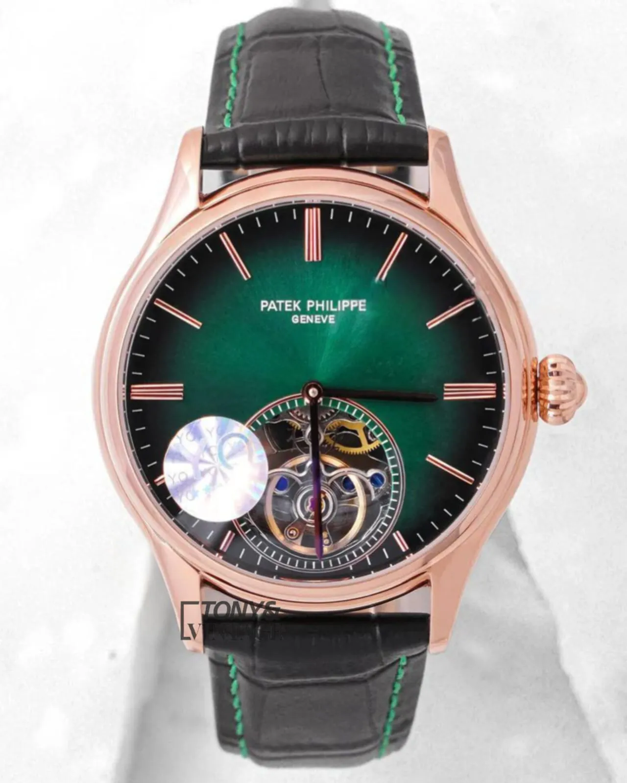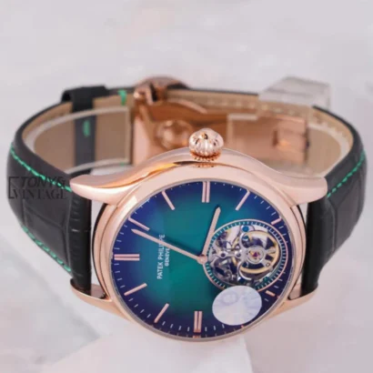 Be the first to review “Tourbillon Rose Gold Watch with Green Dial and Black Leather Strap”